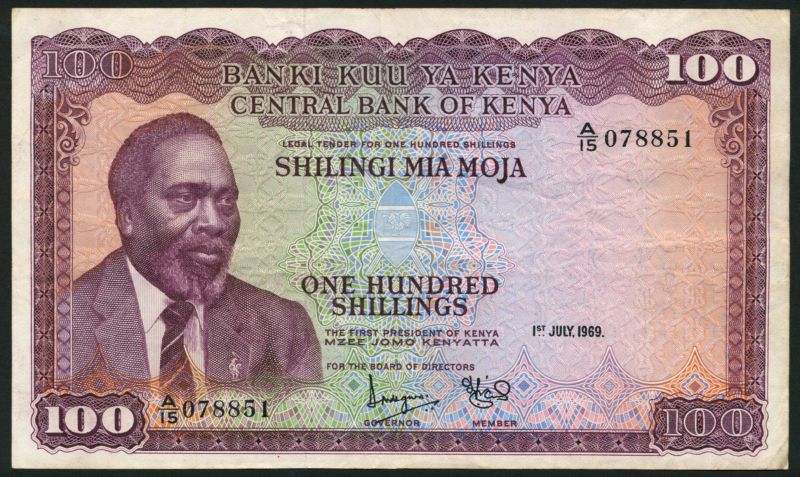 (x) Central Bank of Kenya, 100 shillings (3), 1969, 1971, 1972, prefixes A/15, A/27, A/35, purple and multicoloured, President Jomo Kenyatta at left, value at centre and at each corner