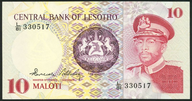 (x) Lesotho Monetary Authority, a group comprising 2 Maloti, 1979, brown and 5 Maloti, 1979, blue, both King Moshoeshoe II at right; Central Bank of Lesotho, a group of the 1981-84 Issues comprising 2 Maloti, 1981, brown, 5 Maloti, 1981, blue, 10 Maloti, 1981, red, 20 Maloti, 1984, green, all King Moshoeshoe II at right