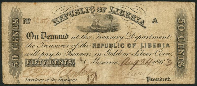 (x) Republic, Treasury Department, 50 Cents, Monrovia, 24 August 1863, black on white, uniface, vignette of ship, coastline, palm tree and plough at upper centre, Type 1 with text, "Pay to bearer in Gold or Silver Coin", manuscript signatures of secretary at left, president at right
