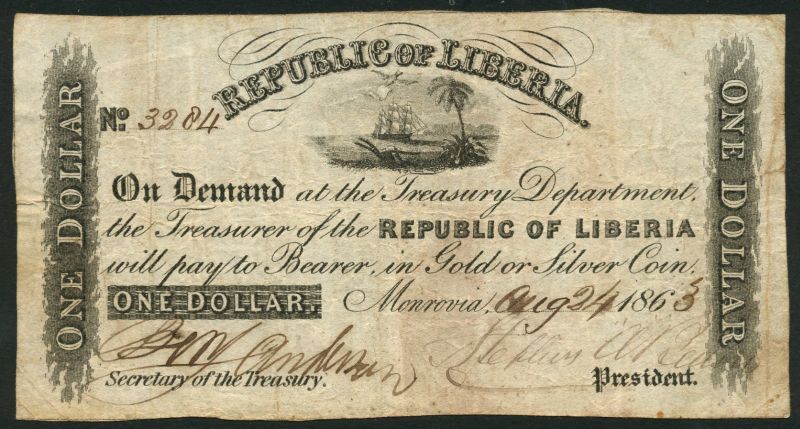 (x) Republic, Treasury Department, $1, Monrovia, 24 August 1863, black on white, uniface, vignette of ship, coastline, palm tree and plough at upper centre, Type 1 with text, "Pay to bearer in Gold or Silver Coin", manuscript signatures of secretary at left, president at right