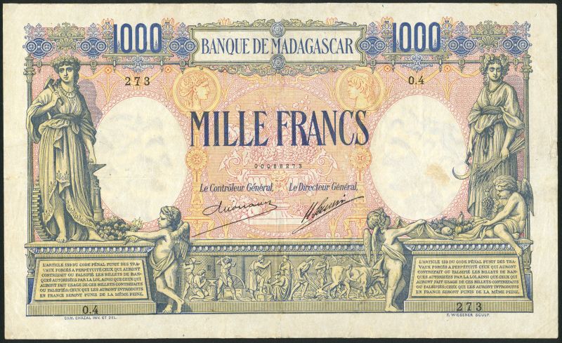 (x) Banque de Madagascar, 1,000 francs, ND (1926), serial number O.4 273, pink, blue and green, allegorical maiden at left and right, Industry and Ceres, cherubs and classical frieze below, value at centre in blue and top left and right, reverse blue and yellow, ornate tableau, Caduceus and cornucopiae at centre; 1926 type signatures