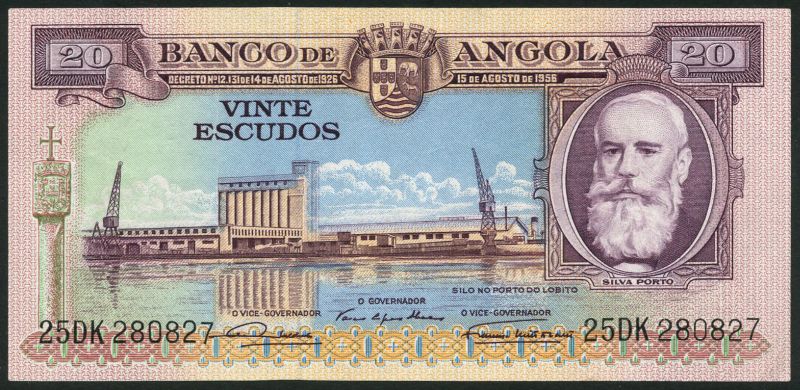 (x) Banco de Angola, 20 escudos, 1956, purple, Porto at right, 50 escudos, 1956, green, De Carvalho at right, 1000 escudos, 1956, brown-purple, Capelo at right