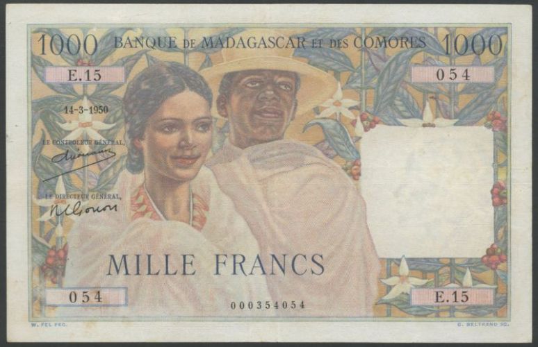 (x) Banque de Madagascar et des Comores, 50 Francs, ND (1951-52), brown and multicoloured, woman with hat at right, reverse man; 100 Francs, ND (1951-52), multicoloured, woman at right, reverse woman, boats and animals; 1000 Francs, 14 March 1950, multicoloured, man and woman at centre left, reverse ox cart