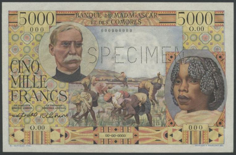 (x) Banque de Madagascar et des Comores, specimen 5000 Francs, ND, serial number O.00000000, multicoloured, portrait of Gallieni at upper left, young woman at lower right, reverse huts at left, woman and child at right, perforated SPECIMEN