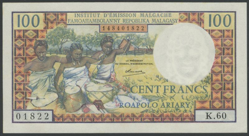 (x) Institut d’Emission Malgache, a small group comprising 100 Francs = 20 Ariary, ND (1966), multicoloured, three women at left, reverse baobab trees; 1,000 Francs = 200 Ariary, ND (1966), multicoloured, man and woman at left, reverse ox cart; 5,000 Francs = 1,000 Ariary, ND (1966) President Tsiranana at left, field workers at right, reverse woman, boy and landscape, 50 Francs = 10 Ariary, ND (1969), multicoloured, woman with hat at right, reverse man
