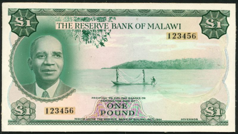 (x) Reserve Bank of Malawi, an obverse and reverse composite essay on board for a £1, law of 1964, serial number 123456, green and multicoloured, Doctor Hastings Banda at left, fishermen in canoe at centre, value low centre and at each corner, reverse green, farmers picking cotton, value at left and right