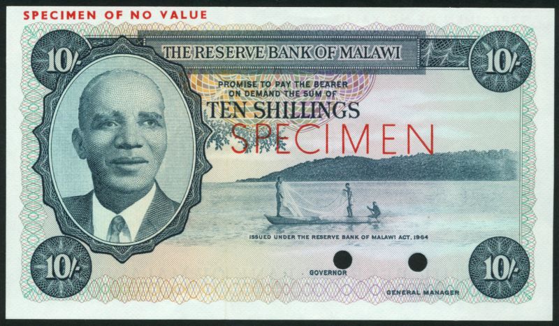 (x) Reserve Bank of Malawi, colour trial 10 shillings, ND (1964), blue-grey and multicoloured, Doctor Hastings Banda at left, fishermen in canoe at right, reverse blue-grey, workers in a tobacco field, value at top