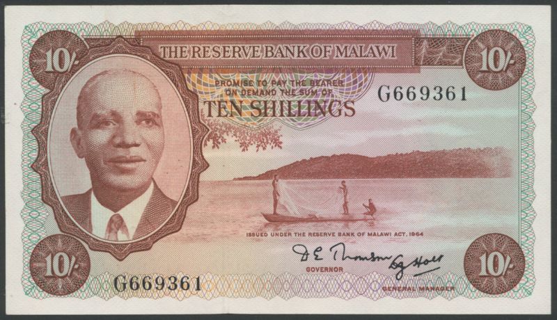 (x) The Reserve Bank of Malawi, a group of the Law of 1964 Issues, all with Dr Hastings Banda at left, fishing boat at right, comprising 5 Shillings, first issue, blue-grey on multicoloured underprint, reverse arms; 10 Shillings, second issue, brown on multicoloured underprint, reverse tobacco field; £1, first issue, green on multicoloured underprint, reverse cotton picking; £5, blue and brown on multicoloured underprint, reverse tea picking