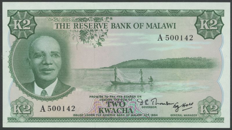 (x) The Reserve Bank of Malawi, a group of the Law of 1964 (1971) Issues, all with Dr Hastings Banda at left, fishing boat at right, comprising 50 Tambala, blue-grey on multicoloured underprint, reverse Independence Arch; 1 Kwacha, brown on multicoloured underprint, reverse tobacco field; 2 Kwacha, green on multicoloured underprint, reverse cotton picking
