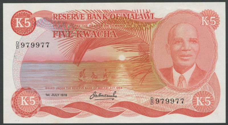 (x) Reserve Bank of Malawi, a group of the 1973-1978 Issues, all with Dr Hastings Banda at right, fishing boat at left, comprising 50 Tambala, ND (1973), blue-grey on multicoloured underprint, reverse sugar cane harvesting; 50 Tambala, 31 January 1976, blue-grey, reverse cotton picking; 1 Kwacha, 31 January 1975, brown on multicoloured underprint, reverse plantation worker; 1 Kwacha, 31 January 1976, brown, reverse tea picking; 5 Kwacha, 1 July 1978, red on multicoloured underprint, reverse field workers