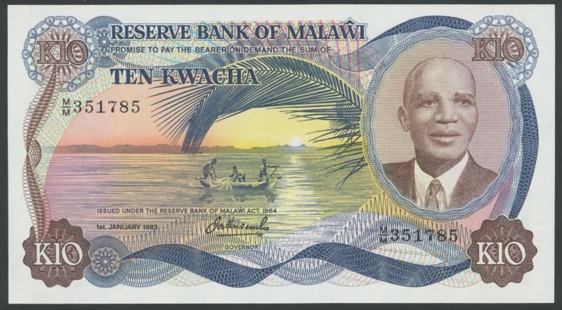 (x) Reserve Bank of Malawi, 10 Kwacha, 1 January 1983, blue and brown on multicoloured underprint, Dr Hastings Banda at right, fishermen on Lake Malawi at left, reverse capital buildings, Lilongwe,