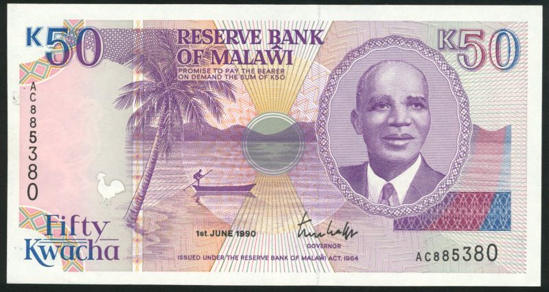 (x) Reserve Bank of Malawi, a group of the 1990 and 1993 Issues, all with Dr Hastings Banda at right, fishing boat at left, comprising 1 Kwacha, 1 May 1992, red-brown, reverse plantation worker; 5 Kwacha (2), 1 December 1990, 1 January1994, red, reverse Lilongwe; 10 Kwacha, 1 January 1994, blue, reverse Lilongwe; 20 Kwacha (3), 1 September 1990 (2), 1 July 1993, green, reverse airport; 50 Kwacha, 1 June 1990, purple, reverse Independence Arch; 100 Kwacha, 1 April 1993, blue, reverse maize silos