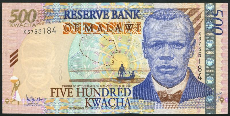 (x) Reserve Bank of Malawi, a group of the 2001-2005 issues 10 Kwacha, 1 January 2003, brown; 20 Kwacha, 1 October 2001, purple; 50 Kwacha, 1 October 2001, aqua; 100 Kwacha, 1 October 2001, red; 200 Kwacha, 1 July 2001, grey-blue; 500 Kwacha (5), 1 December 2001 (2), 1 June 2003 (2), 1 November 2005, multicoloured; also 50 Kwacha, 6 July 2004, green, commemorative issue of forty years of independence, (1964-2004)