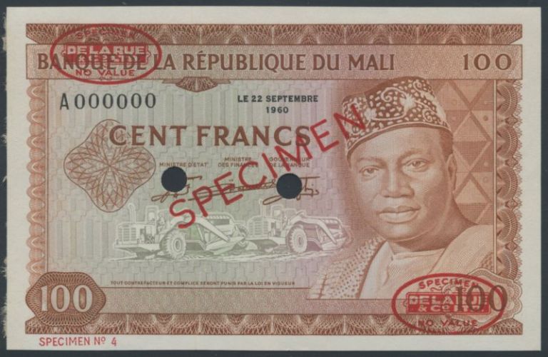 (x) Banque de la Republique du Mali, specimen 50 Francs, purple and multicoloured, Keita at right, reverse woman and village, PMG 64; 100 Francs, brown and multicoloured, Keita at right, reverse man and boats, PMG 64, both dated 22 September, both serial number A000000 and overprinted SPECIMEN in red with two De La Rue Specimen ovals on obverse and reverse, two punch holes