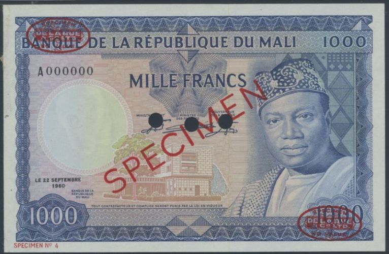 (x) Banque de la Republique du Mali, specimen 1000 Francs, 22 September 1960, serial number A000000, blue and multicoloured, Keita at right, reverse mosque, PMG 63, overprinted SPECIMEN in red with two De La Rue Specimen ovals on obverse and reverse, two punch holes