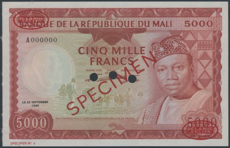 (x) Banque de la Republique du Mali, specimen 5000 Francs, 22 September 1960, serial number A000000, red and multicoloured, Keita at right, reverse market and building, PMG 63, overprinted SPECIMEN in red with two De La Rue Specimen ovals on obverse and reverse, two punch holes