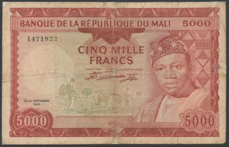(x) Banque de la Republique du Mali, a group comprising 50 Francs, No. B 1302179, purple and multicoloured, Keita at right, reverse woman and village; 500 Francs,No. E 329927, green and multicoloured, Keita at right, reverse longhorn cattle; 5000 Francs, No. A 471822, red and multicoloured, Keita at right, reverse market and building, all dated 22 September 1960