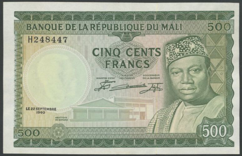 (x) Banque de la Republique du Mali, 500 Francs, 22 September 1960, serial number H248447, green and multicoloured, Keita at right, reverse longhorn cattle