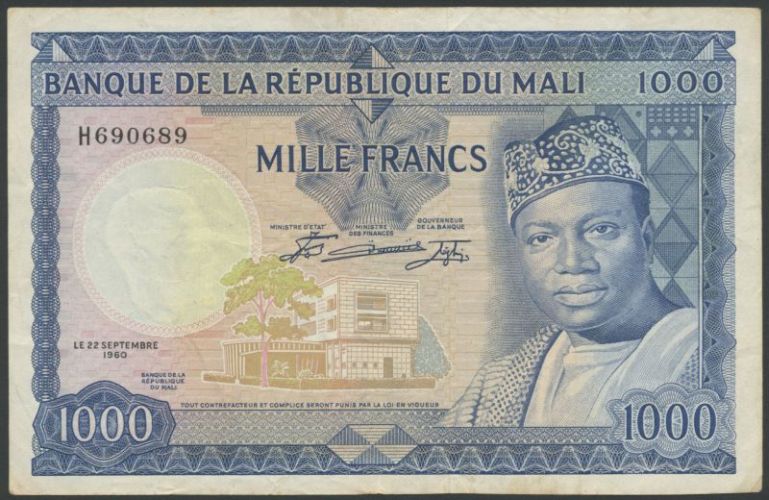 (x) Banque de la Republique du Mali, 1000 Francs, 22 September 1960, serial number H690689, blue and multicoloured, Keita at right, reverse mosque