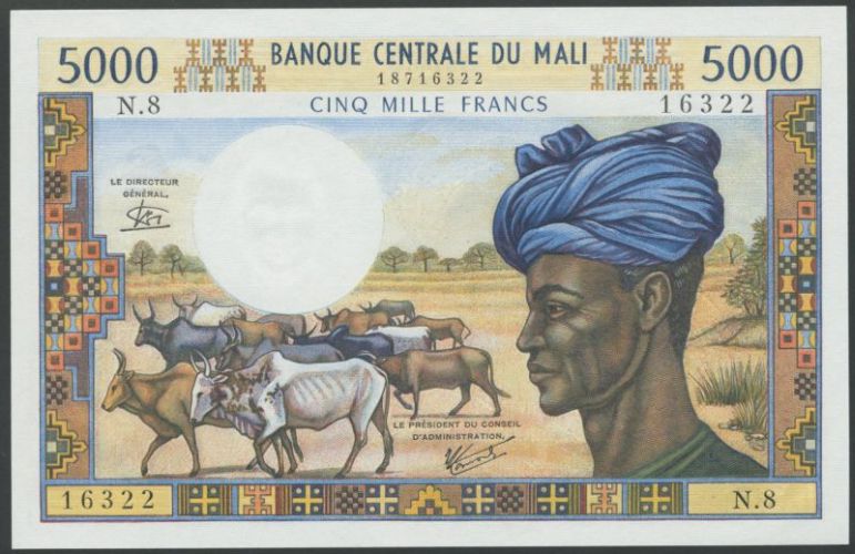 (x) Banque Centrale du Mali, 5000 Francs, ND, (1972-84), blue, brown and multicoloured, man with turban at right, cattle at left, reverse women and cotton industry, signature 8