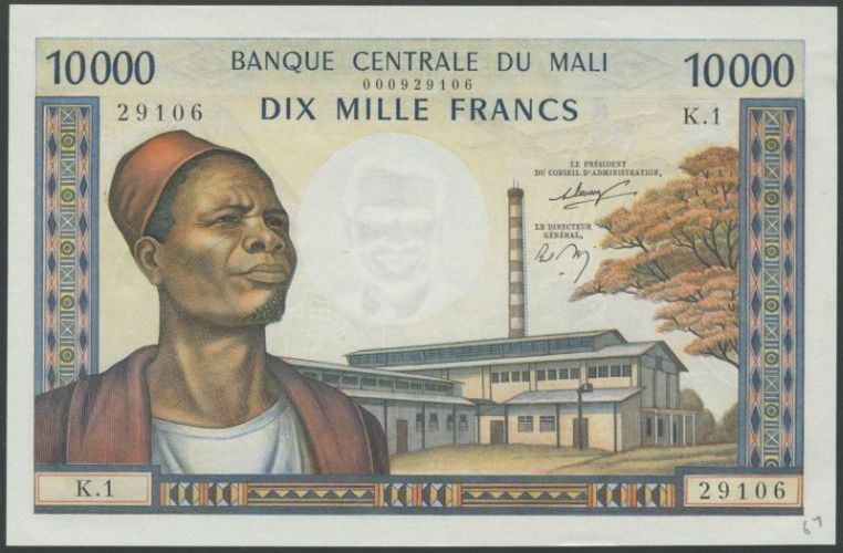 (x) Banque Centrale du Mali, 10,000 Francs, ND, (1970-84), multicoloured, man at left, factory at right, reverse weaving, signature 3