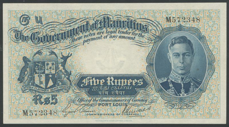 (x) Government of Mauritius, 5 rupees, Port Loius, ND (1937), serial number M572348, 1 October 1916, serial number A 521102, blue and pale pink and white, George VI at right, arms at left, reverse blue and white, bank title and value