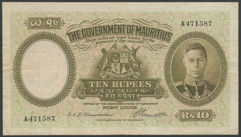 (x) Government of Mauritius, 10 rupees, Port Loius, ND (1937), serial number M572348, brown on green and pink, George VI at right, arms at left, Chamberlain and Ramsden signatures, reverse brown and white, bank title and value