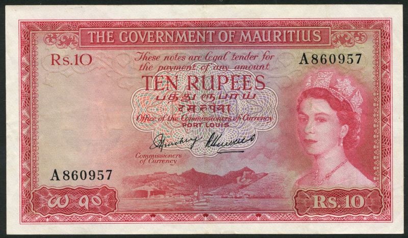 (x) Government of Mauritius, 10 rupees, ND (1954), serial number A 860957, plum red and multicoloured, Elizabeth II at right, shoreline low centre, reverse pink-red and white, arms at centre, value low left and right