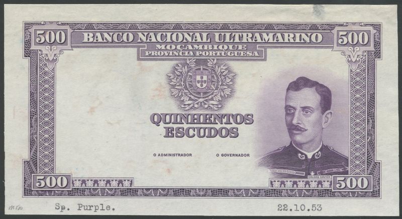 (x) Banco Nacional Ultramarino, a group of uniface stage proofs for 500 Escudos, 1953, brown-violet and multicoloured, one obverse with Caldas Xavier at right, arms at upper centre, four obverses with underprint and one reverse with arms at centre