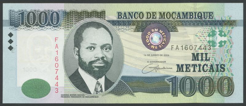(x) Republica de Mocambique, a group of the 1991 - 2006 Issues comprising 500 Metacais, blue, 1,000 Metacais, red, 5000 Metacais, purple, 10,000 Metacais, green, all dated 16 June 1991; 50,000 Metacais, 1993, purple, 100,000 Metacais, 1993, red, 20,000 Metacais, 1999, green, 200,000 Metacais, 2003, green; Banco de Mocambique, 20 Metacais (2), purple, 50 Metacais, brown, 100 Metacais, red, 500 Metacais, red-brown, 1000 Metacais, green, all dated 16 June 2006, all Machel at centre left