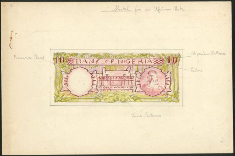 (x) Bank of Nigeria, a hand executed essay on large format card for a proposed issue, no value or date (ca 1960), pale pink-red and green, design of banana plants and palms in field, African man at right