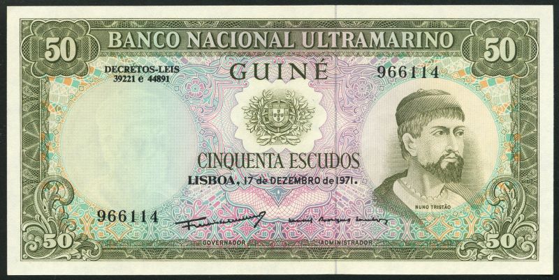 (x) Banco Nacional Ultramarino, 50 escudos, 17 December 1971, serial number 966114, olive green multicoloured, Tristao at right, ship seal at centre, reverse olive, maiden with shipping through the ages, ship seal low left, value at left and right