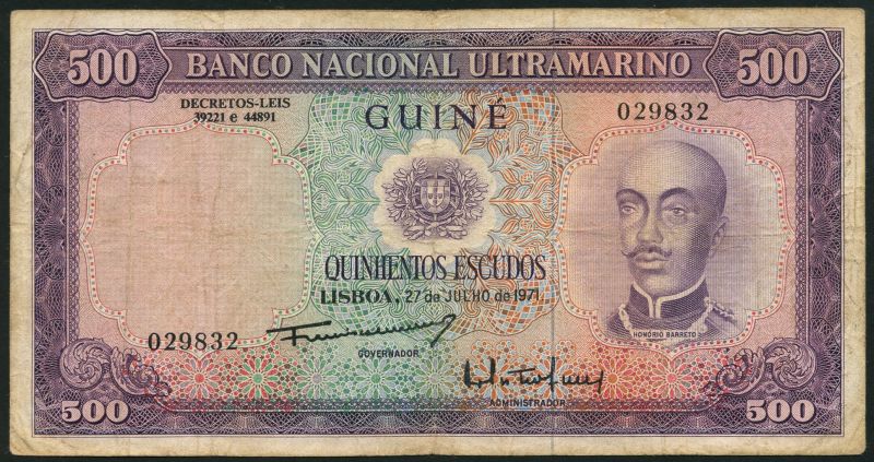 (x) Banco Nacional Ultramarino, 500 escudos, 27 July 1971, serial no. 029832, purple and multicoloured, Hono’rio Barreto at right, coat of arms at centre on obverse, reverse purple and multicoloured, maiden with shipping through the ages, ship seal low left, value at left and right.