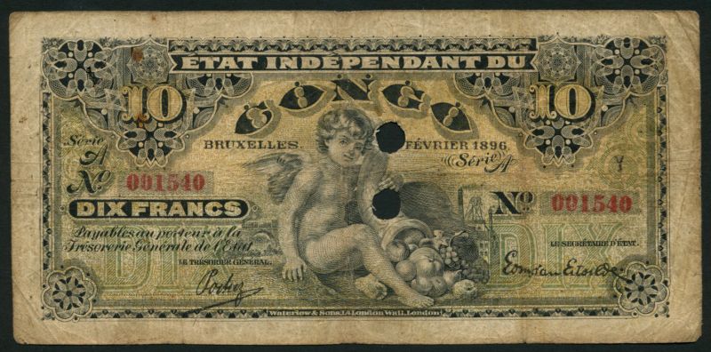 (x) Etat Independant du Congo, 10 francs, February 1896, red serial number 001540, black, pale orange and green, cherub with cornucopia at centre, value top left and right, two printed signatures below, reverse brown and green, maiden at left, value at right