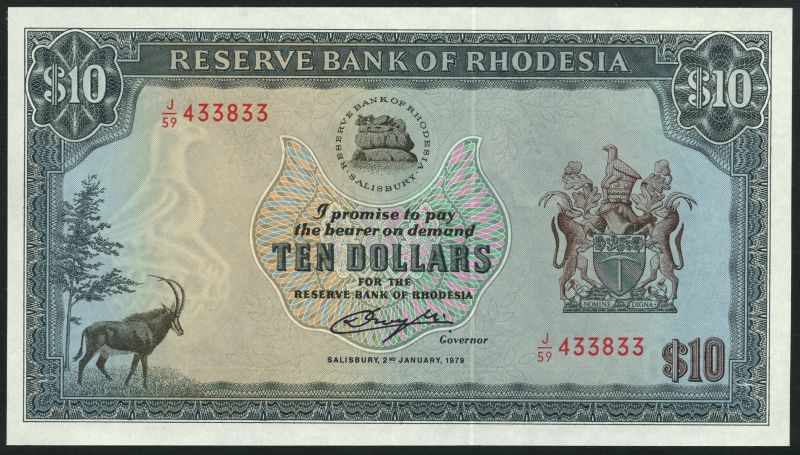 (x) Reserve Bank of Rhodesia, $5 (2), 1976,1978, red prefixes M/14,M/19, brown and multicoloured, coat of arms at right, giraffe at left,logo of the Reserve Bank of Rhodesia, Salisbury at centre, signature D. C. Crough, reverse brown,male and female lions in bush, also $10 (2), 1979, a consecutive pair with red prefix J/59, blue, arms at right, Sable antelope at left, logo of the Reserve Bank of Rhodesia, Salisbury at centre, reverse blue-grey, Great Zimbabwe ruins.