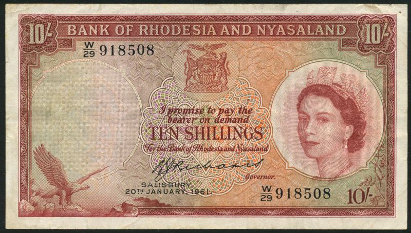 (x) Bank of Rhodesia and Nyasaland, 10 shillings, 20 January 1961, serial number W/29 918508, red-brown and green, Elizabeth II at right, eagle at left, arms top centre, Richards signature, reverse red-brown, river