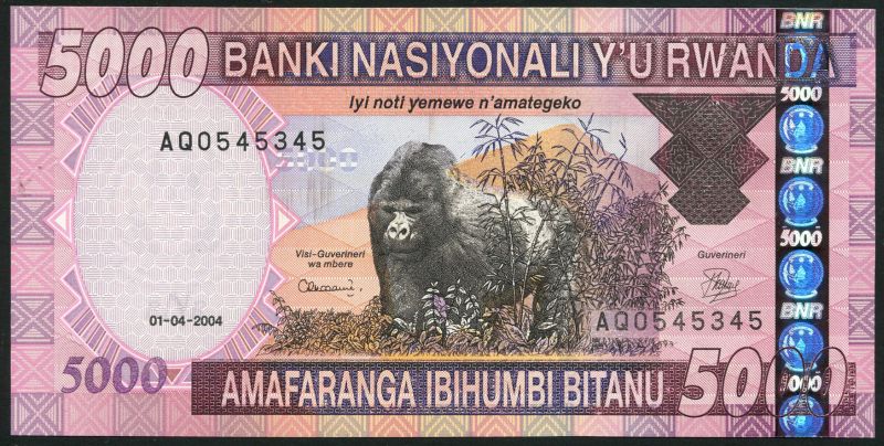 5,000 francs, 1998; 100 francs (2) two dates 2003; 500, 1,000, 2,000 (2) and 5,000 francs, gorilla at centre, all 2004 except the 2,000 francs which are dated 2007 with consecutive numbers; 500