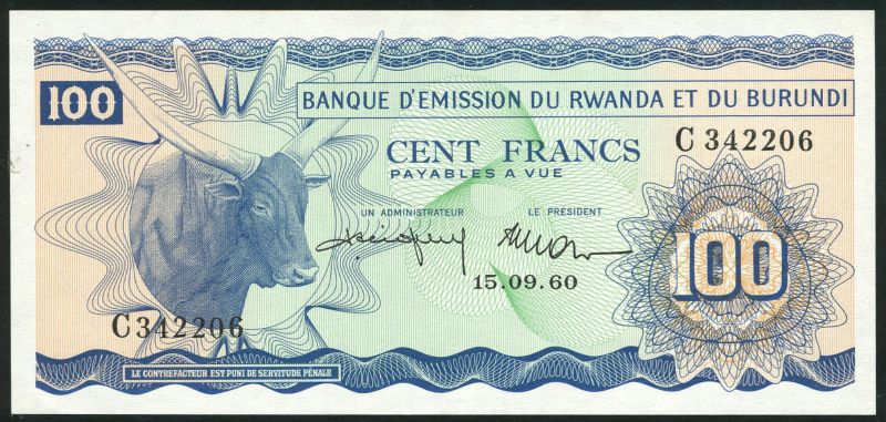 (x) Banque d'Emission du Rwanda et du Burundi, 100 francs, 15 September 1960, prefix C, blue, pink and green, zebu at left, reverse blue and white