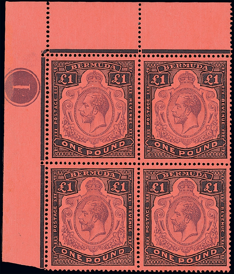 £1 purple and black on red, 3rd. printing, upper left corner plate block of four, fresh mint and mounted in the margins only; light diagonal crease at top of [1]; A very fine multiple and the scarcest of the three printings. Photo