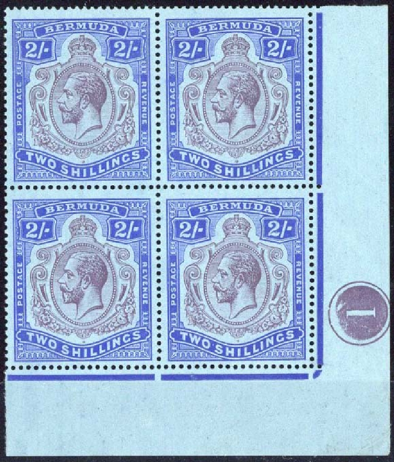 2/- purple and bright blue on pale blue marginal block of four, [39-52] with HPF51, fresh unmounted mint; diagonal gum crease, otherwise fine