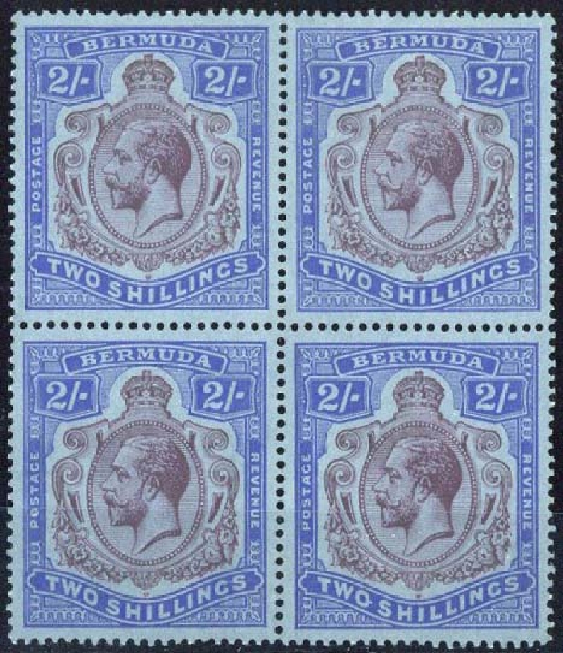 2/- purple and blue on grey blue block of four, [44-57], with HPF45A, fresh lightly mounted mint; fine and most attractive