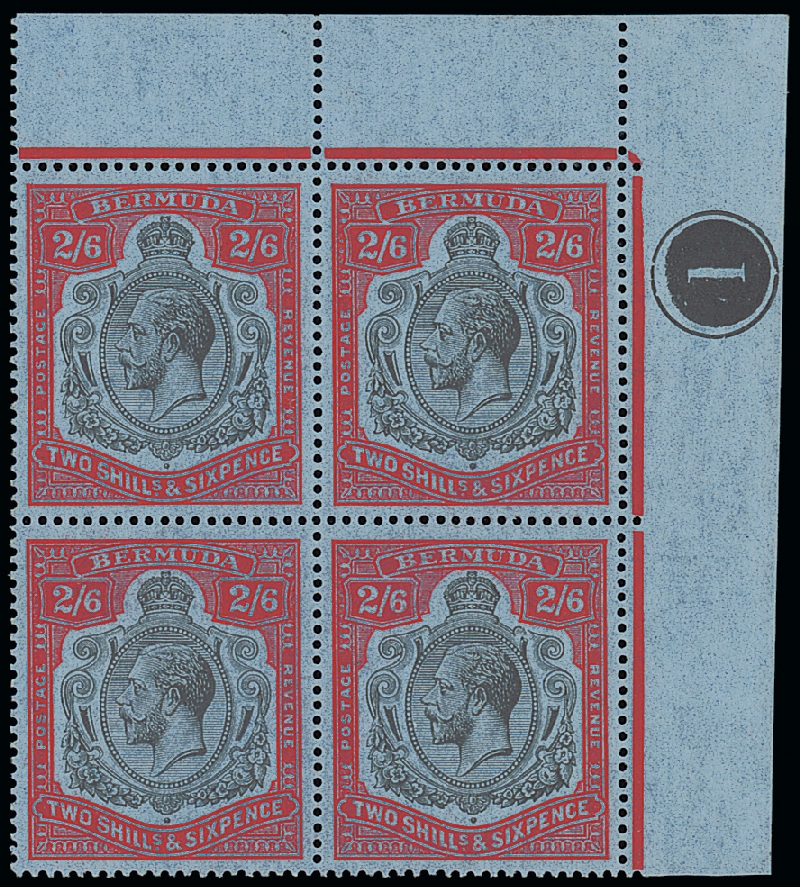 2/6d. black and carmine-red on deep grey-blue, 7th. printing (August 1930), upper right corner plate block of four, [11-24], HPF12 break in scroll and volute and HPF24 broken in crown and scroll, fresh mint with hinge remainders on [23] and margin only; very fine. S.G. 89i, 89ia, 89ib, £1,200+. Photo