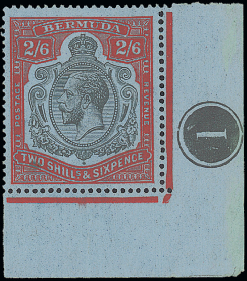 2/6d. black and scarlet-vermilion on deep blue, 9th. printing (September 1931), lower right corner example with plate number, HPF60 gash in fruit and leaf and break in volute, fresh lightly mounted mint; small light mark in value tablet at left, otherwise fine. S.G. 89jd, £550. Photo
