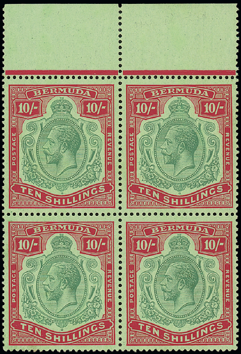 10/- green and red on pale emerald, 3rd. printing (December 1924), marginal block of four, [11-24], [11] break in scroll and [24] broken crown and scroll, unmounted mint; very fine. S.G. 92, 92a, 92b, £1,830+. Photo