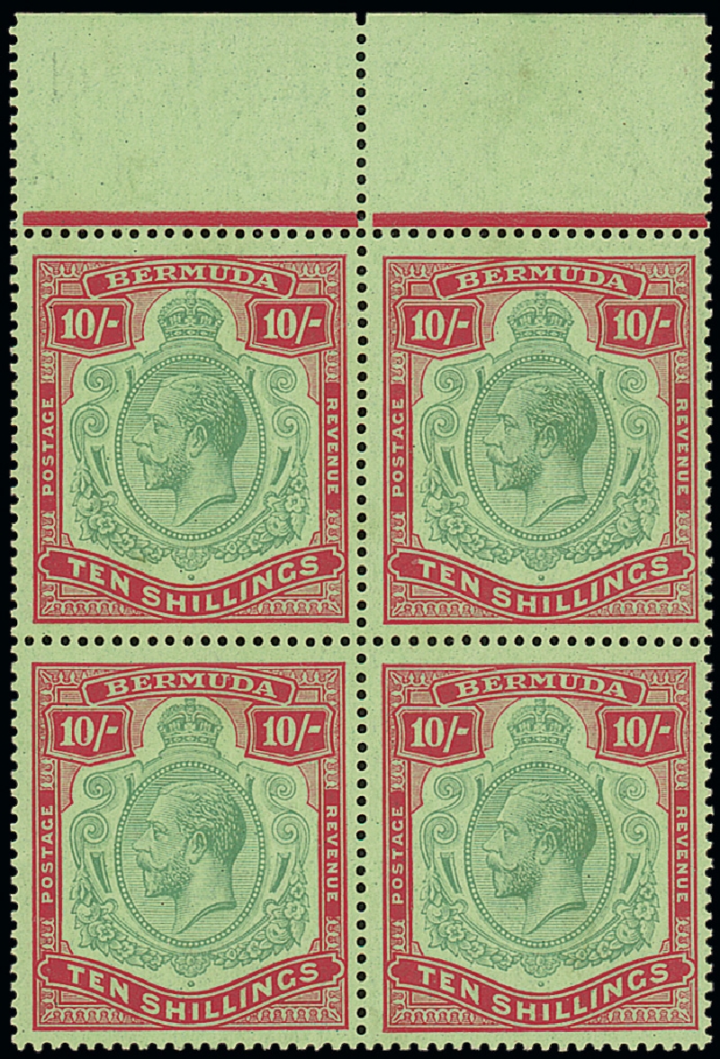 10/- green and red on pale emerald, 3rd. printing (December 1924), marginal block of four, [11-24], [11] break in scroll (trace) and [24] broken crown and scroll, pale head plate, lightly mounted mint; a couple of light fox marks on gum not affecting fine appearance. S.G. 92, 92a, 92b, £1,830+. Photo
