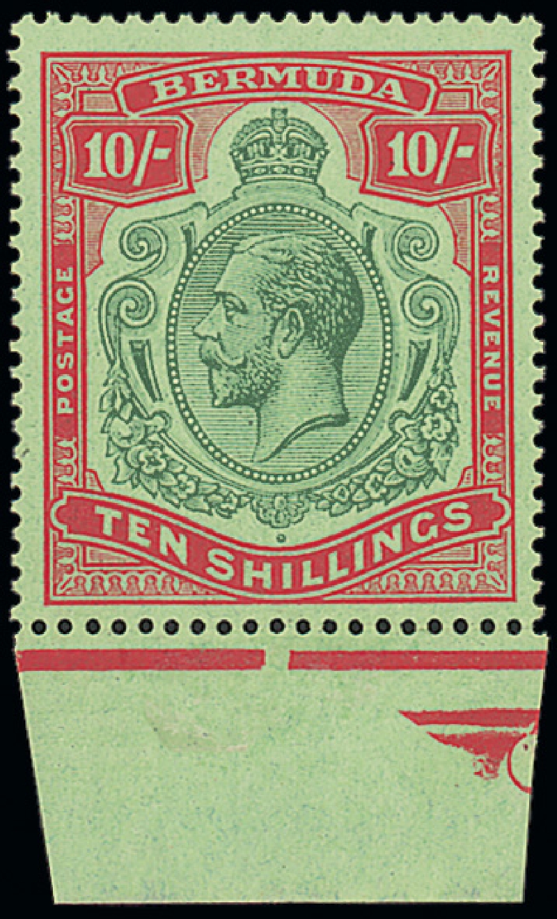 10/- green and red on pale emerald, 3rd. printing (December 1924), marginal, HPF54 damaged leaf at bottom right, fresh mint with the stamp remaining unmounted; small hinge remainder on face of margin; very fine. S.G. 92f, £800. Photo