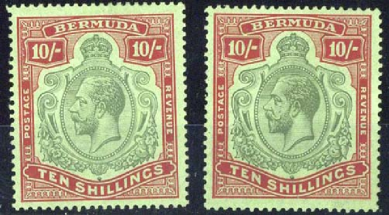 10/- deep green and deep red on pale yellow-green, 4th. printing (August 1926), two shades, one HPF3A indentation in the outline of lower left scroll, the other with dot on King's cheek, fine mint