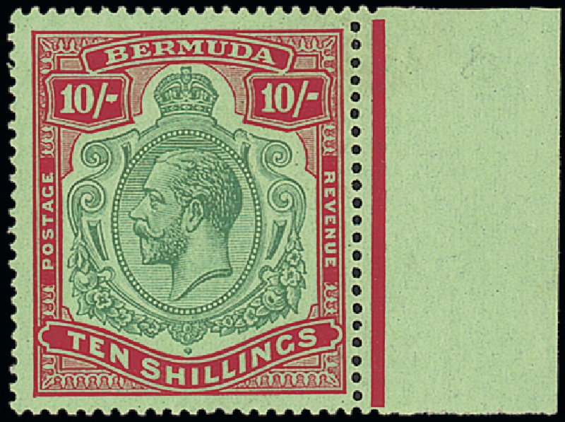 10/- deep green and deep red on pale yellow-green, 4th. printing (August 1926), marginal, HPF24A, B, fresh mint with the stamp remaining unmounted; diagonal gum bend. S.G. 92b, £700. Photo