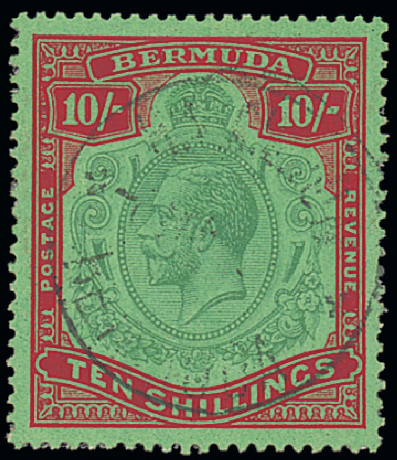 10/- green and red on emerald, 5th. printing (May 1928), used with Hamilton c.d.s.; head plate pale. Photo
