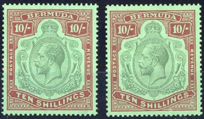 10/- green and red on deep emerald, 7th. printing (August 1930), two slightly different shades, fine mint with one unmounted. S.G. 89g. S.G. 89g